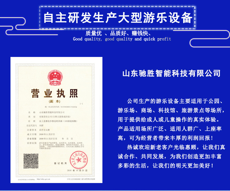 山東馳勝智能科技集團(tuán)有限公司秉承“向遠(yuǎn)方,容世界,敢為先,造歡樂”的經(jīng)營理念-追求和打造景區(qū)游樂場四季休閑游樂品牌作為發(fā)展目標(biāo)